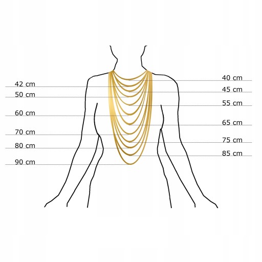 Ilustracja prezentuje w przybliżeniu, jakie odzwierciedlenie na sylwetce mają poszczególne długości łańcuszka. Proszę jednak pamiętać, że w zależności od postury, naszyjniki mogą się prezentować nieco inaczej. Najbezpieczniej jest więc przy pomocy kawałka sznurka lub nitki, stojąc przed lustrem, wymierzyć odpowiednią dla siebie długość.