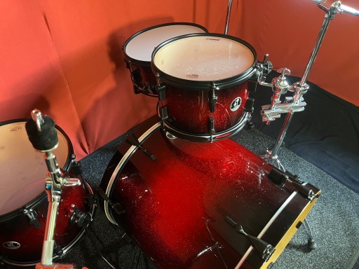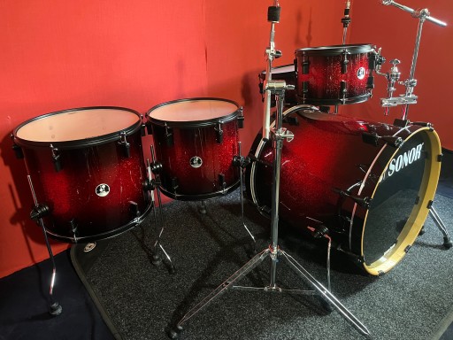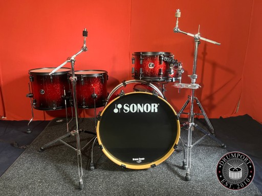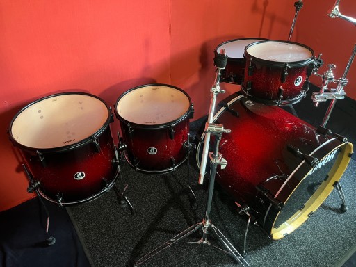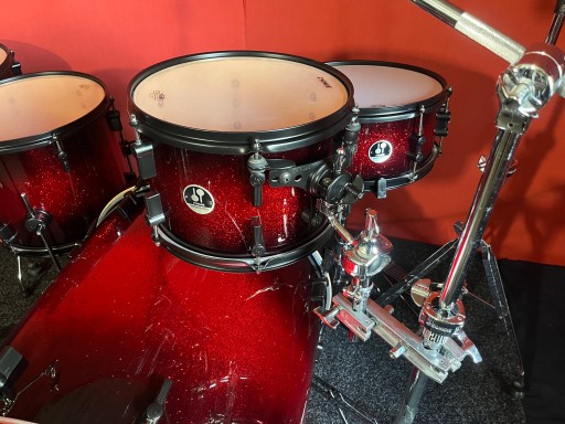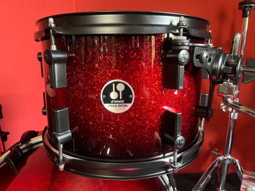 Perkusja jest w bardzo dobrym stanie i w pełni sprawna. Nosi ślady normalnego użytkowania, kilka rys na centrali, korpusy wykonane z klonu. Kompletny solidny i oryginalny hardware Sonor. Piękny brokatowy lakier.