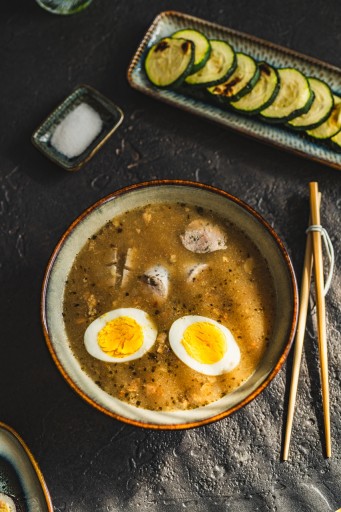 Przenieś swoje doświadczenie kulinarne na wyższy poziom dzięki naszej wyjątkowej misce do zupy RAMEN. Idealna dla miłośników autentycznych azjatyckich smaków. Specjalna faktura i kolorystyka nawiązują do tradycyjnych japońskich naczyń, tworząc niepowtarzalny klimat podczas posiłku. Głęboki i szeroki kształt miski pozwala na komfortowe serwowanie obfitych porcji makaronów a także innych zup czy dań. Została zaprojektowana tak, aby podkreślić bogactwo i aromat Twojego ulubionego dania. W zestawie znajdują się bambusowe pałeczki, które doskonale uzupełniają całość i pozwalają na pełne doświadczenie japońskiej kuchni. Kolorystyka w odcieniach granatu i ciemnej zieleni wprowadza do kuchni naturalny i ciepły akcent.