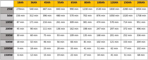 Poniżej tabela z orientacyjnym czasem pracy przy zastosowaniu akumulatorów AGM, GEL marki INERGE