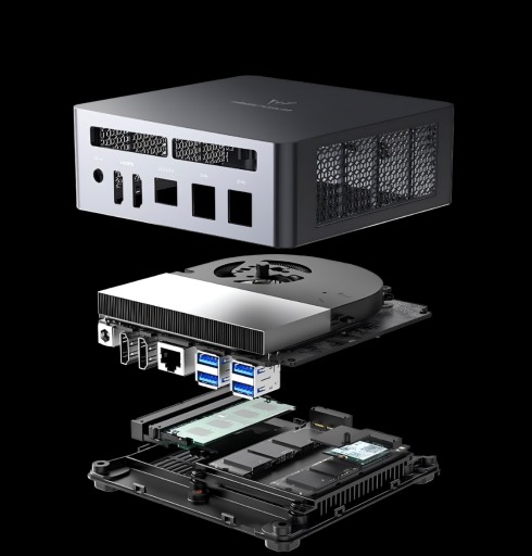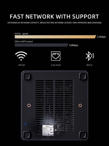 Ten mini komputer oferuje szybki port LAN 2.5G Ethernet, który zapewnia stabilne połączenie z siecią – idealne do pracy zdalnej, grania online i przesyłania dużych plików. Na wyposażeniu znajduje się również Wi-Fi 6E oraz Bluetooth 5.3 – dla lepszego zasięgu i niezawodnego działania akcesoriów bezprzewodowych, takich jak słuchawki, myszki czy klawiatur