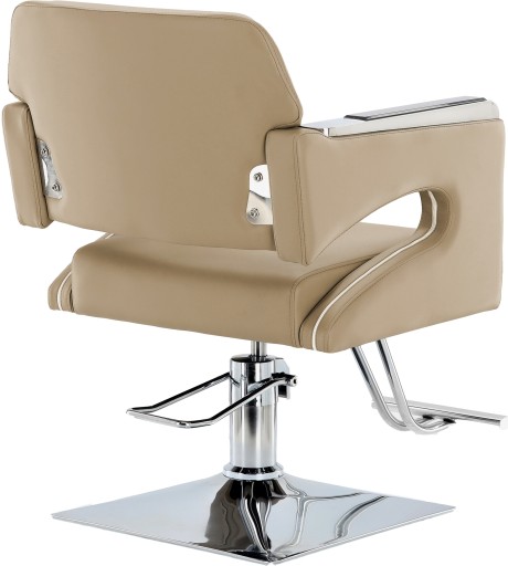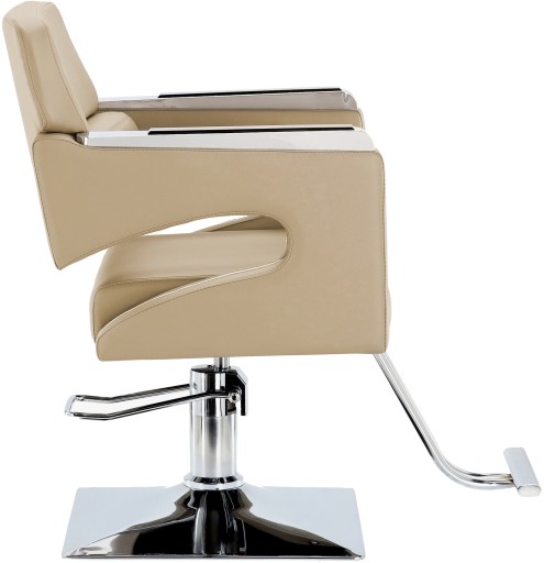 Fotel charakteryzuje się eleganckim i ergonomicznym designem, który pozwala na wygodną pracę fryzjera oraz relaks klientów.