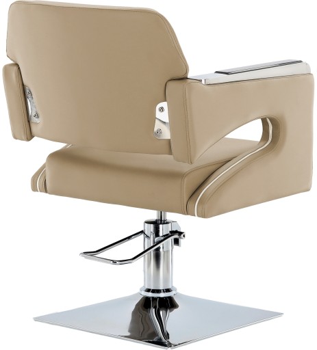 Fotel charakteryzuje się eleganckim i ergonomicznym designem, który pozwala na wygodną pracę fryzjera oraz relaks klientów.