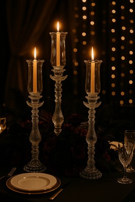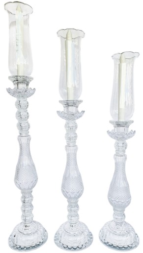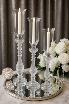 Wprowadź wyjątkowy klimat do swojego wnętrza dzięki zestawowi trzech kryształowych świeczników z kloszami. Każdy z nich to połączenie klasycznej formy z luksusowym wykończeniem – idealne do salonu, jadalni, sypialni czy na uroczysty stół.