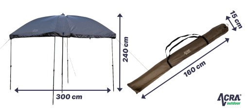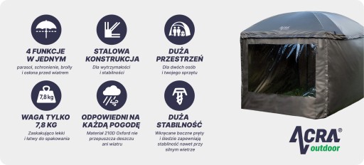 ACRA Outdoor Shelter XXL to idealny wybór dla wędkarzy, miłośników kempingu i natury. Dzięki solidnej stalowej konstrukcji, wysokiej jakości materiałom i sprytnemu rozwiązaniu oferuje stabilność, komfort i łatwość obsługi. Ponadto ma aż cztery funkcje w jednym, ponieważ można go używać jako parasol, daszek, brolly i osłonę przed wiatrem.