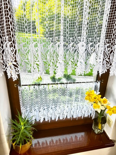 Przedmiotem sprzedaży jest gipiurowa śnieżnobiała firanka typu zazdrostka o wysokości całkowitej 70 cm, pomimo zastosowania techniki przeplatania nici w grupach firaneczka nie jest zbyt ciężka , zastosowany ażurowy wzór nadaje lekkości i przejrzystości Firaneczka jest cięta z walka i nie wymaga obszywania , bardzo ważną cechą jest również to że nie trzeba jej prasować, dodatkowa zaletą jest fakt że można taką zazdrostkę powiesić również na żabkach karnisza.
