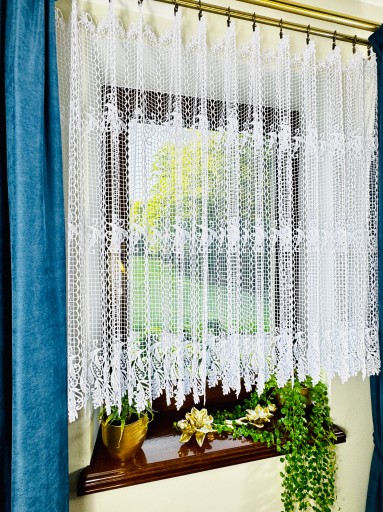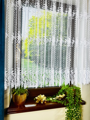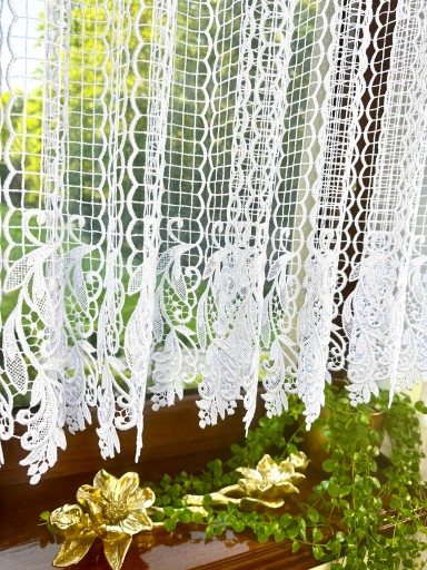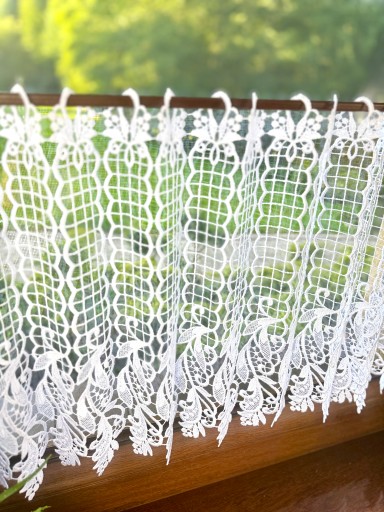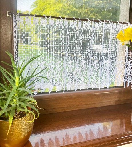 Przedmiotem sprzedaży jest gipiurowa śnieżnobiała firanka typu zazdrostka o wysokości całkowitej 40 cm, pomimo zastosowania techniki przeplatania nici w grupach firaneczka nie jest zbyt ciężka , zastosowany ażurowy wzór nadaje lekkości i przejrzystości Firaneczka jest cięta z walka i nie wymaga obszywania , bardzo ważną cechą jest również to że nie trzeba jej prasować, dodatkowa zaletą jest fakt że można taką zazdrostkę powiesić również na żabkach karnisza.