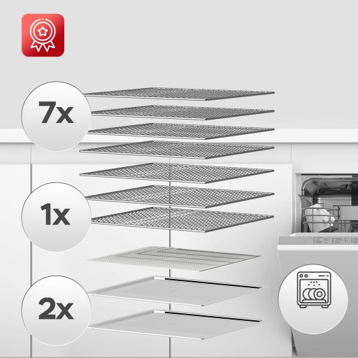 - 7 szt tacka stalowa z siatki – wykonana z wysokiej jakości stali nierdzewnej SS 304, odporna na korozję i bezpieczna w kontakcie z żywnością. Idealna do suszenia owoców, warzyw oraz mięsa.