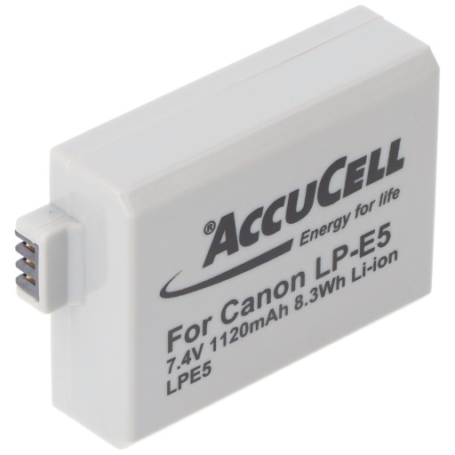 Akumulator litowo-jonowy 7,4 V, 800-1000 mAh. Kompatybilny z akumulatorem Canon LP-E5. Wysokiej jakości akumulator z elektroniką zabezpieczającą przed przeładowaniem i przegrzaniem. Ta bateria ma zabezpieczenie przeciwzwarciowe. Akumulator można ładować za pomocą istniejącej ładowarki.