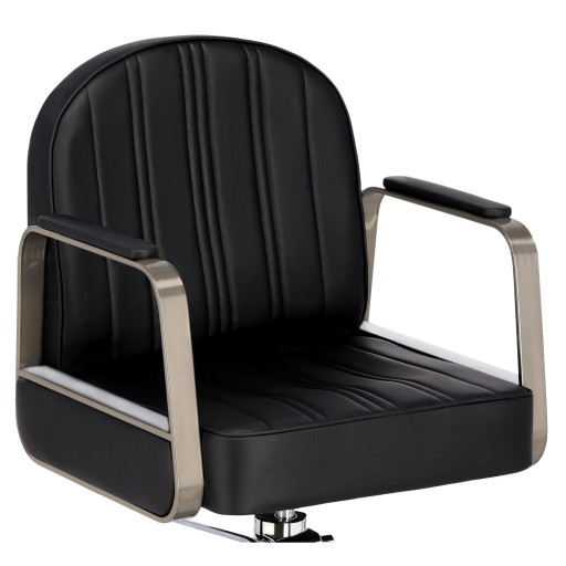 Fotel charakteryzuje się eleganckim i ergonomicznym designem, który pozwala na wygodną pracę fryzjera oraz relaks klientów.