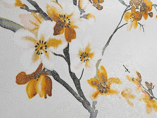 - Kolor: białe tło, odcienie beżu, pomarańczowego, szarości, kwiatki z wtopionymi drobinkami złotego brokatu