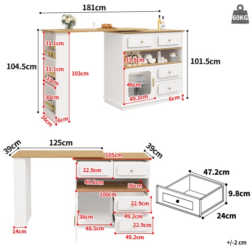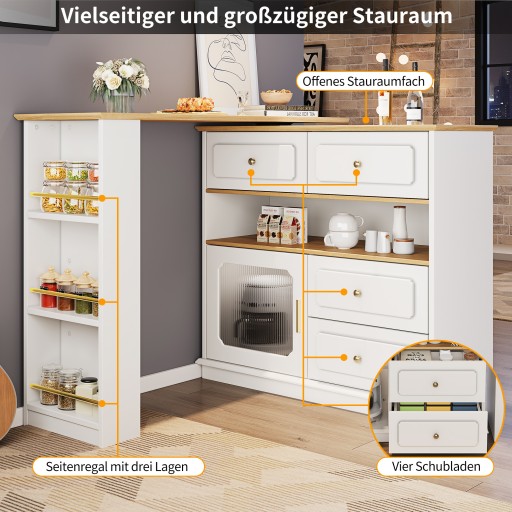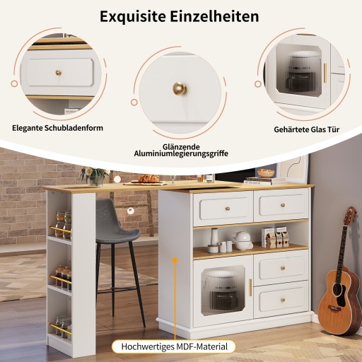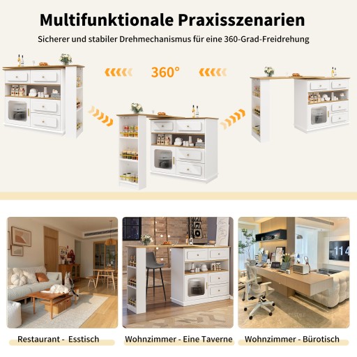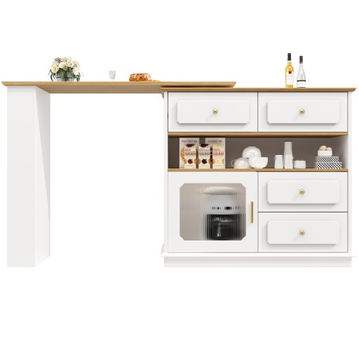 Rozkładany stół barowy z miejscem do przechowywania (125-181×39×104,5 cm), obrotowy stół jadalny 360°, nowoczesny ruchomy stół barowy, wysoki stół bistro z wyspą kuchenną, szafka kredensowa z półkami i szkłem, biały