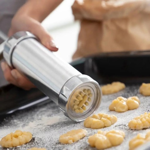 Wielofunkcyjna maszynka do robienia ciastek 2 w 1, która pozwala zaoszczędzić czas, wysiłek i miejsce w kuchni, gdyż jednocześnie służy jako szpryca do dekoracji wyrobów cukierniczych. Jest to bardzo łatwy w użyciu ręczny przyrząd kuchenny, który pozwala na wspólne rodzinne przygotowanie pysznych i oryginalnych ciastek z naturalnych składników bez wychodzenia z domu. Idealny dla dzieci i dorosłych, umożliwia miło spędzić czas podczas produkcji kreatywnych wypieków i cieszyć się doświadczeniem tworzenia i dekorowania własnych ciasteczek w gronie rodzinnym, przyczyniając się również do zdrowszej i zrównoważonej diety. Ten wielofunkcyjny pistolet do dekoracji ciasta i szpryca z ergonomicznym uchwytem ma cylindryczny kształt i nadaje się do ciasta na ciastka, śmietany, czekolady, kremów, itp. Maszynkę łatwo się myje, gdyż można bez problemu rozłożyć ją na części. Zawiera instrukcję obsługi i podstawowy przepis na ciastka.