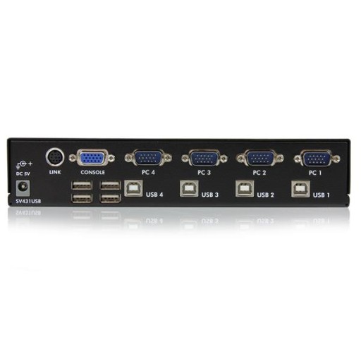 SV431USB 4-portowy przełącznik KVM VGA USB do montażu w szafie serwerowej z koncentratorem umożliwia proste sterowanie maksymalnie czterema komputerami za pomocą jednego monitora/wyświetlacza i zestawu urządzeń peryferyjnych USB (klawiatura, mysz).