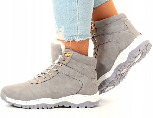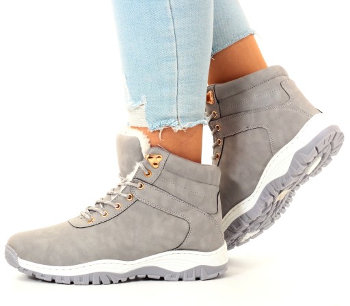 Damskie, wsuwane traperki w kolorze szarym. Posiadają ocieplenie w postaci futerka- idealne na zimę❗ Wiązanie na sznurówki reguluje tęgość obuwia. ❄ Stabilna, gruba podeszwa dobrze amortyzuje stopę oraz chroni przed zimnem. Wykonane z dobrych jakościowo materiałów. Prosty fason sprawia, że pasują do wielu stylizacji.