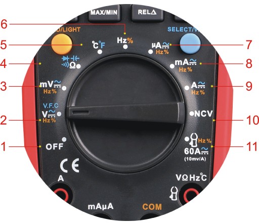 - Pomiar natężenia prądu AC/DC: 600 μA / 6000 μA / 60 mA / 600mA / 6A / 10A