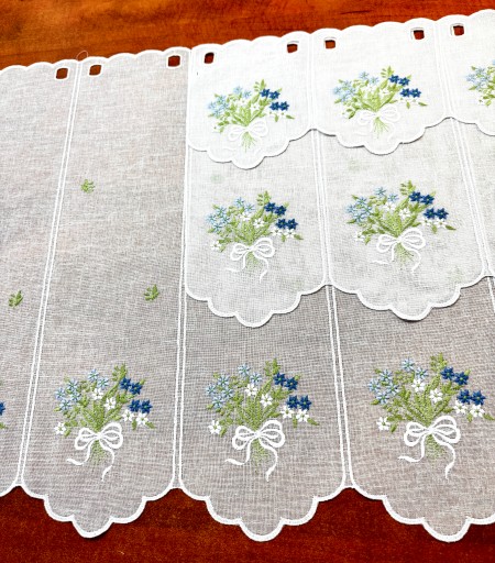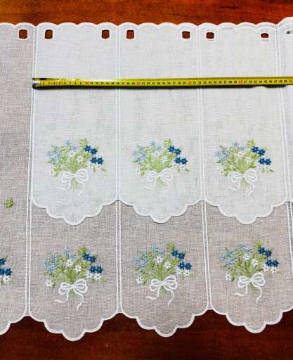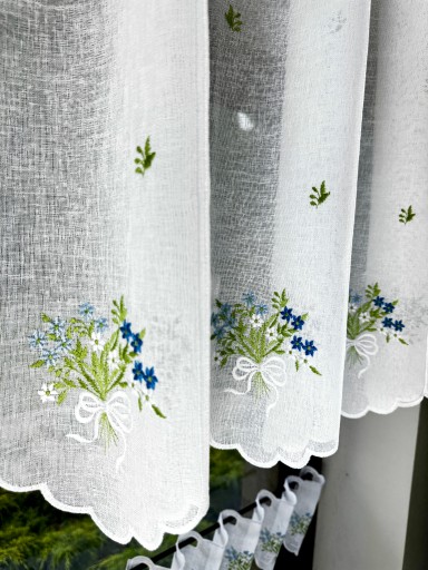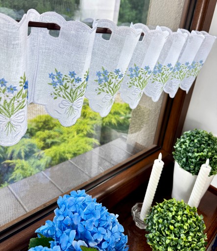 Przedmiotem sprzedaży jest biała firanka typu zazdrostka . Tkanina do złudzenia przypomina delikatny naturalny len przyozdobiony haftem niezapominajki w kolorze błękitno chabrowym z zielonymi gałązkami to idealny sposób na odświeżenie kuchennego okna.