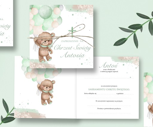 Zaproszenia na Chrzest Święty Kwadratowe - wzór Baby Mint Bear