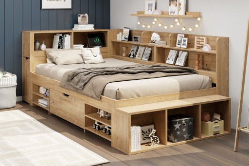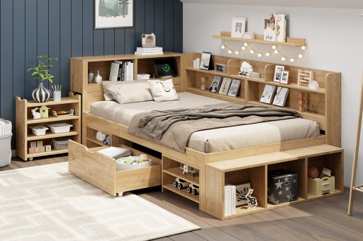 Ukryta szafka do przechowywania u wezgłowia łóżka, szuflada z boku łóżka i szafki wokół łóżka do przechowywania różnych przedmiotów, takich jak ubrania, zabawki, książki itp.