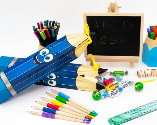 Widoczne na zdjęciu słodycze, linijka, kredki, artykuły piśmiennicze, są jedynie częścią ekspozycji i nie należ ą do zest awu.