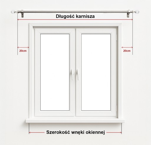 Sama długość rury karnisza powinna być dobrana względem szerokości okna i wystawać o około 20/30 cm od krawędzi wnęki okiennej z obu stron.