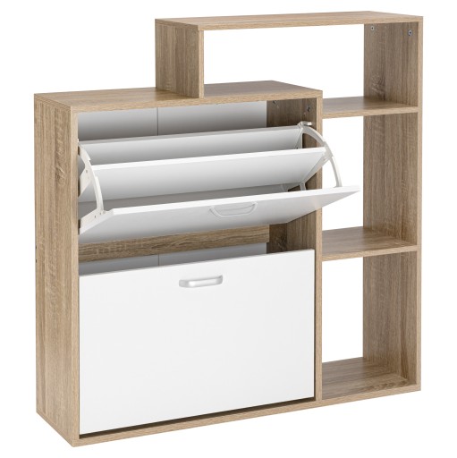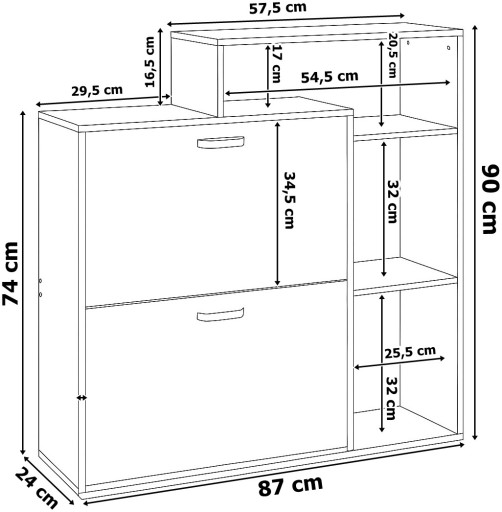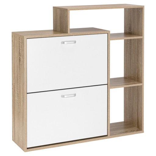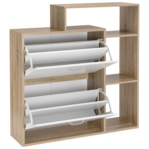 Szafka ma dwa otwierane fronty z dwoma poziomami w każdym. Umożliwia to przechowywanie wielu par butów w uporządkowany sposób.
