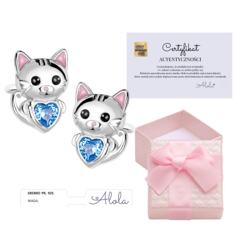Srebrne kolczyki kotki dla dziewczynki, wykonane ze srebra próby 925, oprawione błękitną cyrkonią, która dodaje blasku.