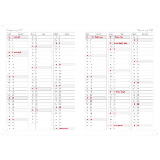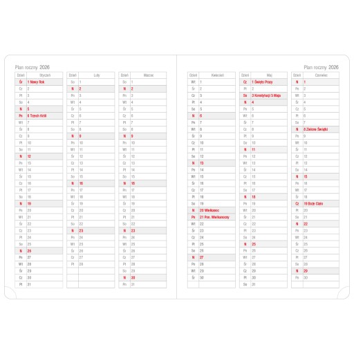 - skrócony kalendarz bieżącego i następnego miesiąca na każdej rozkładówce