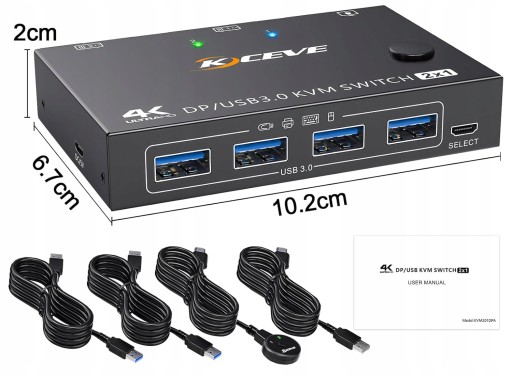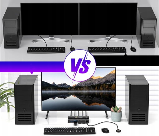 - Wsparcie techniczne - dostawa 1 x przełącznik KVM, 2 x kabel USB-A, 1 x kabel zasilający, 1 x podręcznik użytkownika (może nie być dostępny w języku polskim). Każdy komputer wymaga 1 kabla DP1.4 + 1 x kabel USB do podłączenia do przełącznika KVM. W przypadku komputera stacjonarnego lub laptopa bez złącza DP należy użyć niezawodnego adaptera lub stacji dokującej USB-C. Dlatego mogą wystąpić błędy kompatybilności.