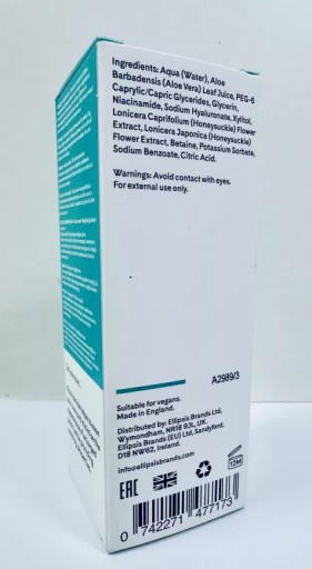 Skład : Aqua (Water), Aloe Barbadensis (Aloe Vera) Leaf Juice, PEG-6 Caprylic/Capric Glycerides, Glycerin, Niacinamide, Sodium Hyaluronate, Xylitol, Lonicera Caprifolium (Honeysuckle) Extract, Lonicera Japonica (Japanese Honeysuckle) Extract, Betaine, Potassium Sorbate, Sodium Benzoate, Citric Acid.