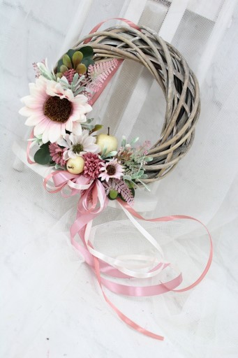 Udekorowany jesiennymi kwiatami słonecznika i astrów w tonacji pudrowego różu.