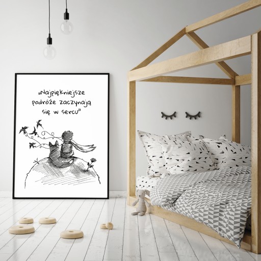 Ten wyjątkowy plakat to połączenie subtelnej ilustracji i ponadczasowego cytatu z książki „Mały Książę”. Idealnie sprawdzi się jako dekoracja pokoju dziecka, wprowadzając do wnętrza nutę poezji, marzeń i ciepła.