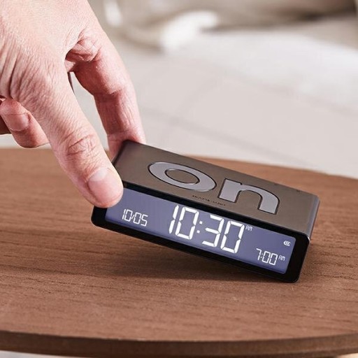 Budzik LEXON Flip Classic wyróżnia się nietypową, dwustronną konstrukcją. Włączanie i wyłączanie alarmu odbywa się przez odwrócenie budzika. Strona „on” oznacza aktywny alarm, a „off” – jego wyłączenie. Prosto i bez szukania przycisków po omacku.