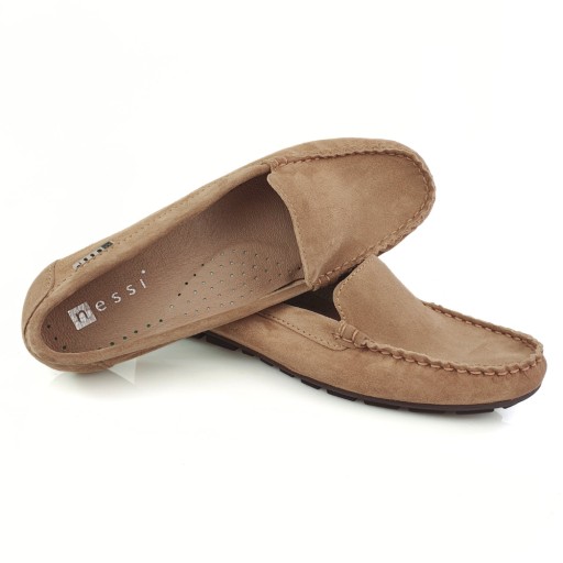 Mokasyny wykonane w całości z wysokogatunkowej skóry zamszowej w kolorze beżowym.