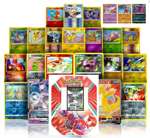 Pokémon TCG – Zestaw 100 Oryginalnych Kart + 10 Holo + 2 Legendarne + Puszka Kolekcjonerska
