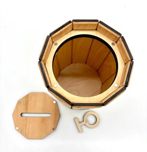 Elegancka i praktyczna skarbonka wykonana z drewna litego, przeznaczona do zbierania napiwków w barach, restauracjach, kawiarniach czy pubach.