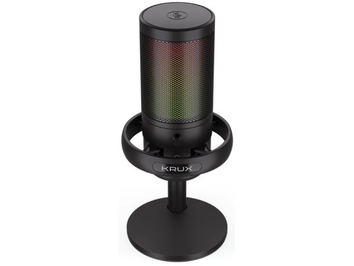 Ułatwienia i uproszczenia to jedno, ale pozostaje pytanie – gdzie jest styl? Akurat mikrofonowi Krux Epic 1000S go nie brakuje, bo pod czarną obudową i pokrywą kapsuły kryje się świecące jak tysiąc barwnych słońc podświetlenie RGB. Stawiasz go przed sobą na biurku, odpalasz komputer i nagle wszystko dookoła robi się ładniejsze.