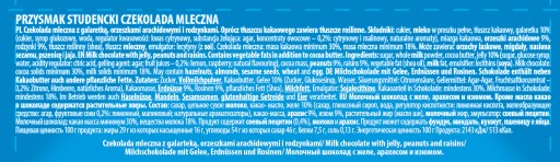 Orzechy? Są. Rodzynki? Są. Galaretka? Jest. Szykuje się więc niezła wyżerka! Wyborny mix oblany mleczną czekoladą Wawel, ujmujący, zachwycający, po prostu pyszny. Znajdziesz w nim wszystko, co przywoła radość, doda energii lub pozwoli uczcić sukces – drobny czy wielki, Twój lub kogoś bliskiego. Nie wykręcaj się! Zawsze znajdzie się okazja, aby sięgnąć po kostkę Przysmaku studenckiego. Nie zmarnuj żadnej z nich i celebruj wyjątkowe chwile wyjątkową kompozycją starannie skomponowanych składników.