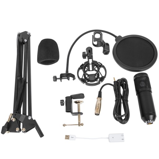 Mikrofon pojemnościowy USB/Jack z pełnym wyposażeniem, w tym gąbką, pop filtrem, uchwytem i przewodami, zapewnia czyste brzmienie.