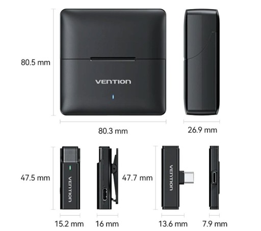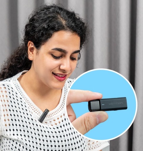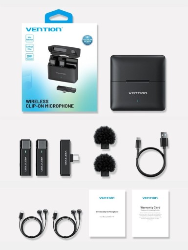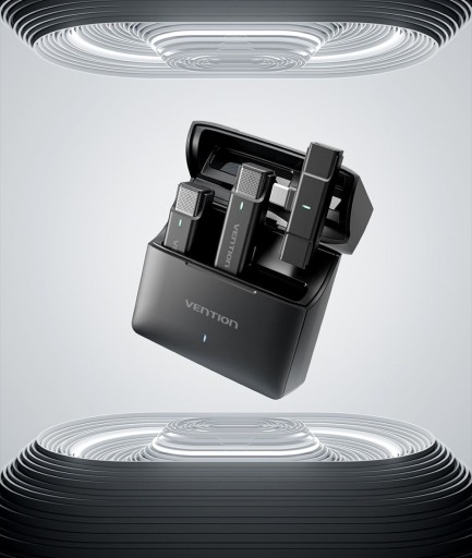 Vention USB C 2Pack Wireless Lavalier Mic (NCAB0) to solidny duet bezprzewodowych mikrofonów z etui ładującym, oferujący krystalicznie czysty dźwięk, ogromny zasięg i aż do 30?h pracy z energią w pokrowcu. Idealnie sprawdzi się do transmisji, vlogów i wywiadów, zawsze gotowy do działania, bez kabli, bez komplikacji.