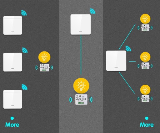 Każdy odbiornik może przechowywać około 5 przełączników bezprzewodowych. Możesz więc udostępnić przełączniki rodzinie. Jeden nadajnik może również sterować wieloma odbiornikami. Na przykład 1 włącznik zainstalowany na ścianie obok drzwi sypialni, a drugi umieszczony na szafce nocnej.