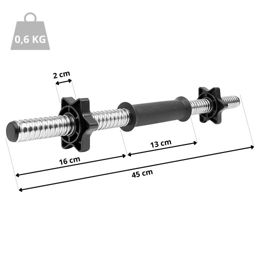 W komplecie znajdziesz 2 krótkie gryfy 45 cm do ćwiczeń z hantlami.