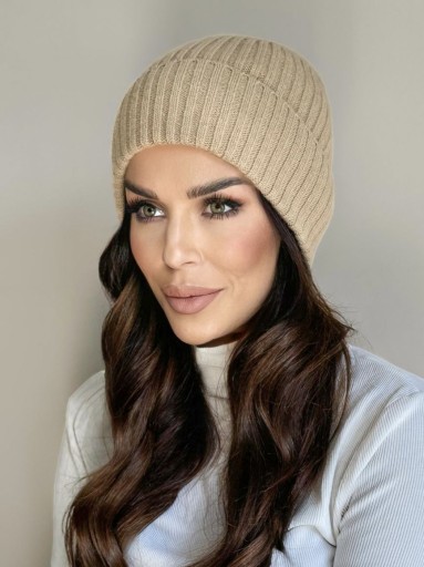 ✅ Czapka typu beanie/krasnal, delikatnie opadająca, wywijana.