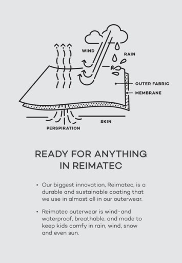 Kombinezon zimowy ReimaTec dla dzieci uszyty jest z wiatroszczelnego i oddychającego materiału o właściwościach hydrofobowych, który nie wchłania brudu. Wszystkie szwy uszczelniono w celu zapewnienia dodatkowej ochrony przed przemakaniem. Kombinezon został wzmocniony na pośladkach, kolanach i brzegach rękawów i nogawek. Odpinany kaptur nie tylko chroni przed zimnym wiatrem, ale również zapewnia bezpieczeństwo podczas zabawy na dworze. Dzięki zapięciu na zatrzaski kaptur łatwo się odpina, gdy się o coś zahaczy. Silikonowe paski pod stopy utrzymują brzegi nogawek w miejscu, niezależnie od tego, jak szybko dziecko się przemieszcza. Kombinezon ma również dwie kieszenie zapinane na suwak oraz elementy odblaskowe.