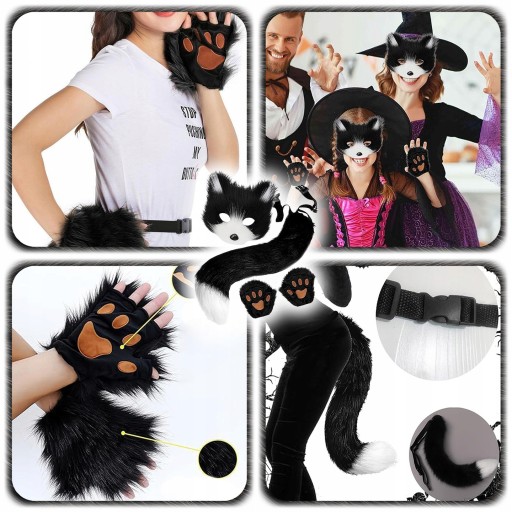 Chcesz dodać swojej stylizacji pazura i wyróżnić się na imprezie? Ten zestaw w stylu czarnego kotka to świetny wybór na bal przebierańców, Halloween, cosplay czy sesję zdjęciową. Wykonany z miękkiego, sztucznego futra i dopracowany w detalach, sprawi, że wcielisz się w postać w pełni – z futrzanym ogonem, tajemniczą maską i uroczymi rękawiczkami.