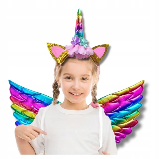 ✅ Skrzydła jednorożca – Efektowne, metaliczne skrzydła w tęczowych barwach, które łatwo się zakłada i zapewniają wspaniały bajkowy efekt.