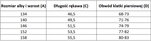 Na tej aukcji sprzedajemy albę o rozmiarze 128. Prosimy zmierzyć dziecko przed zakupem i porównać wymiary z wartościami w tabeli poniżej. Dzięki temu uzyskacie Państwo pewność, że zamówiony rozmiar będzie odpowiedni.