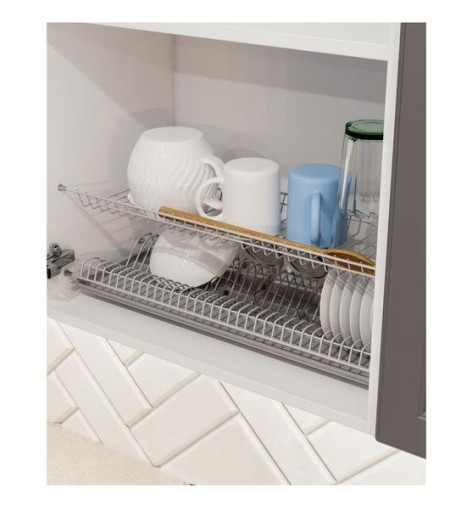 Suszarka do naczyń szafkowa 60 cm Standard Rejs sprawdzi się wszędzie tam, gdzie brakuje miejsca na blacie na tradycyjną, zewnętrzną suszarkę. Posiada dwa poziomy, które pomieszczą znaczną ilość umytych naczyń. Jeden z poziomów jest wyprofilowany tak, aby bezpiecznie suszyć talerze i inne płaskie naczynia, drugi natomiast posiada płaską powierzchnie, idealną na kubki czy garnki. W zestawie znajduje się również tacka ociekarkowa.