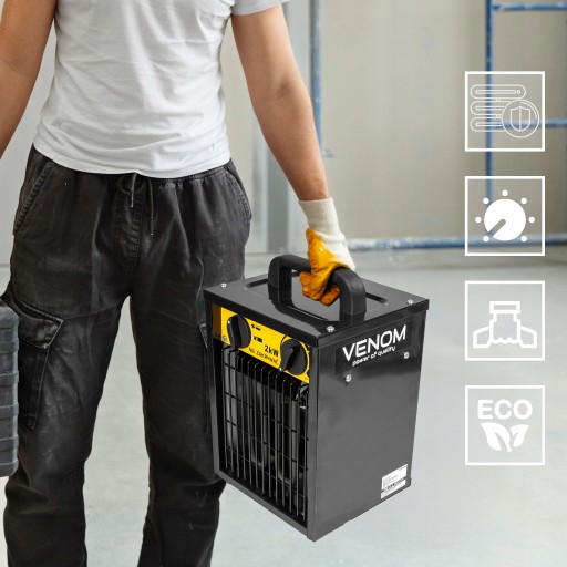 ✅ VENOM HeatFlow 2000™ – nagrzewnica elektryczna o mocy 2000 W, która błyskawicznie podnosi temperaturę w pomieszczeniu, zapewniając szybki komfort cieplny.