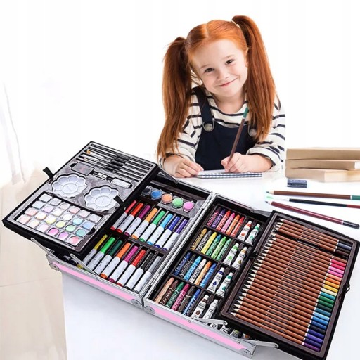 Zestaw do malowania w walizce będzie doskonałym prezentem dla każdego małego artysty, szeroka gama kolorystyczna kredek, farb i flamastrów zapewni długie godziny zabawy oraz pozwoli rozwinąć skrzydła twórczej wyobraźni.